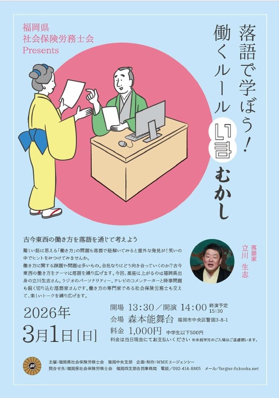 - 福岡県社会保険労務士会福岡中央支部では、広報活動の一環として「落語で学ぼう!働くルール いま むかし」を開催します。